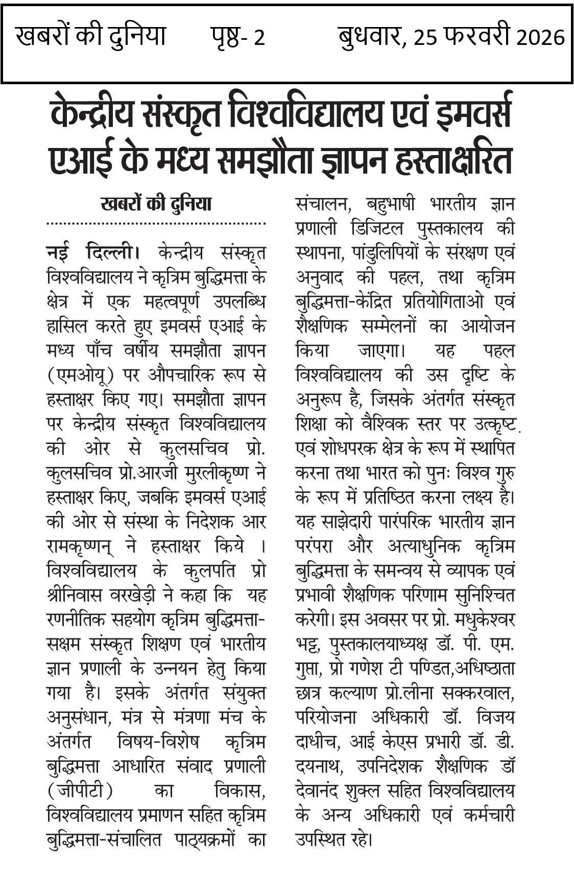 यह समाचार लेख केन्द्रीय संस्कृत विश्वविद्यालय, नई दिल्ली और इमवर्स एआई के मध्य हस्ताक्षरित समझौता ज्ञापन (एमओयू) पर आधारित है। यह पाँच वर्षीय समझौता संस्कृत शिक्षा और भारतीय ज्ञान परंपरा के साथ कृत्रिम बुद्धिमत्ता (एआई) के समन्वय पर केंद्रित है। इस सहयोग के अंतर्गत एआई आधारित संवाद प्रणालियों का विकास, विश्वविद्यालय प्रमाणित एआई पाठ्यक्रम तथा संयुक्त अनुसंधान पहल शामिल हैं। इसके अतिरिक्त बहुभाषी डिजिटल पुस्तकालय की स्थापना, संस्कृत पांडुलिपियों का संरक्षण और अनुवाद, तथा एआई विषयक प्रतियोगिताओं और शैक्षणिक सम्मेलनों का आयोजन भी प्रस्तावित है। इस एमओयू पर कुलपति प्रो. श्रीनिवास वरखेडी तथा इमवर्स एआई के निदेशक रामकृष्णन ने हस्ताक्षर किए। इस साझेदारी का उद्देश्य संस्कृत अध्ययन को वैश्विक स्तर पर प्रोत्साहित करना और भारत को ज्ञान व अनुसंधान के प्रमुख केंद्र के रूप में सुदृढ़ करना है।