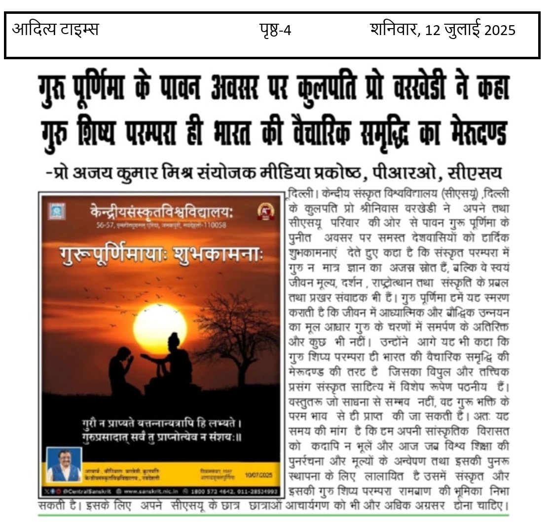 This news article is based on a statement by Prof. Shrinivasa Varakhedi, Vice-Chancellor of Central Sanskrit University, on Guru Purnima. He highlighted that the Guru-Shishya tradition is central to India’s intellectual heritage, emphasizing guru's role in knowledge, values, and culture. He urged preserving this tradition amid global educational reforms.