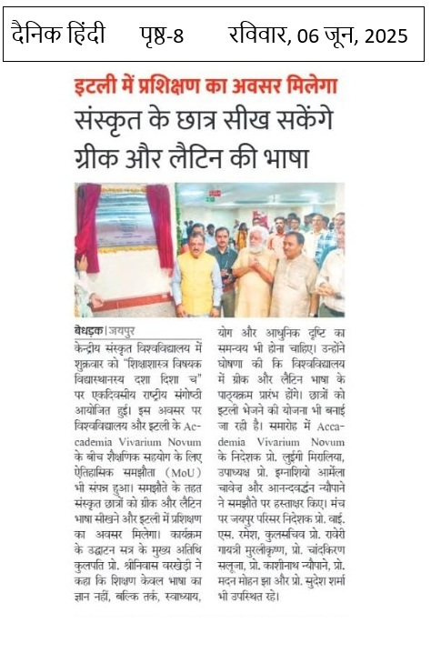 This news article is based on the academic collaboration between Central Sanskrit University Jaipur Campus and Italy’s Accademia Vivarium Novum. A historic Memorandum of Understanding (MoU) was signed to allow Sanskrit students to study Greek and Latin languages and receive training in Italy. Hon'ble Vice-Chancellor Prof. Shrinivasa Varakhedi announced the launch of Greek and Latin courses at the university. He emphasized that language learning must integrate logic, self-study, yoga, and a modern outlook. The MoU was signed during a one-day national seminar on “Philosophy of Education,” marking a new chapter in international Sanskrit education.