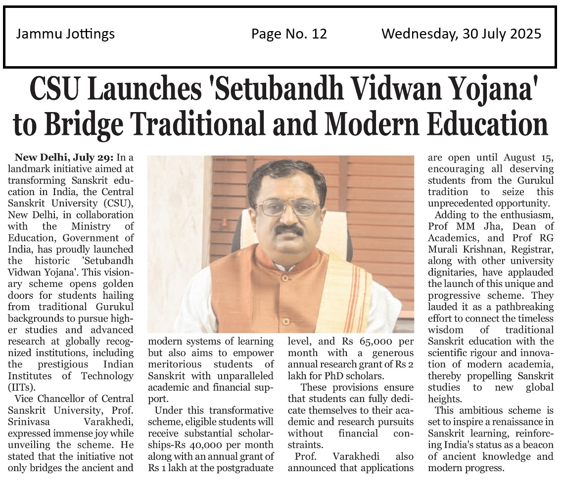 This news article is based on a statement by Prof. Shrinivasa Varakhedi, Vice-Chancellor of Central Sanskrit University, highlighting the launch of the Setubandh Vidwan Yojana a visionary scheme aimed at bridging traditional Gurukul education with modern academic institutions like IITs. The initiative offers generous scholarships and research grants to meritorious Sanskrit students pursuing postgraduate and PhD studies, empowering them academically and financially while promoting integration of ancient wisdom with contemporary knowledge systems.