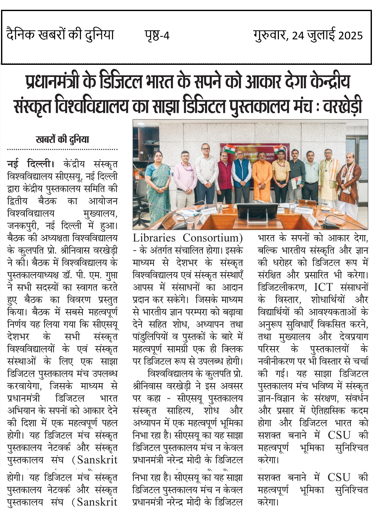 This news article is based on a statement during the second Central Library Committee meeting in Central Sanskrit University New Delhi. It announced the creation of a Shared Digital Library Platform under the Sanskrit Libraries Consortium, connecting Sanskrit universities and institutions nationwide. This initiative supports the Digital India mission, enabling access to Sanskrit manuscripts, books, and research materials online. It aims to preserve and promote India’s ancient knowledge digitally and strengthen CSU’s role in advancing Sanskrit education and research.