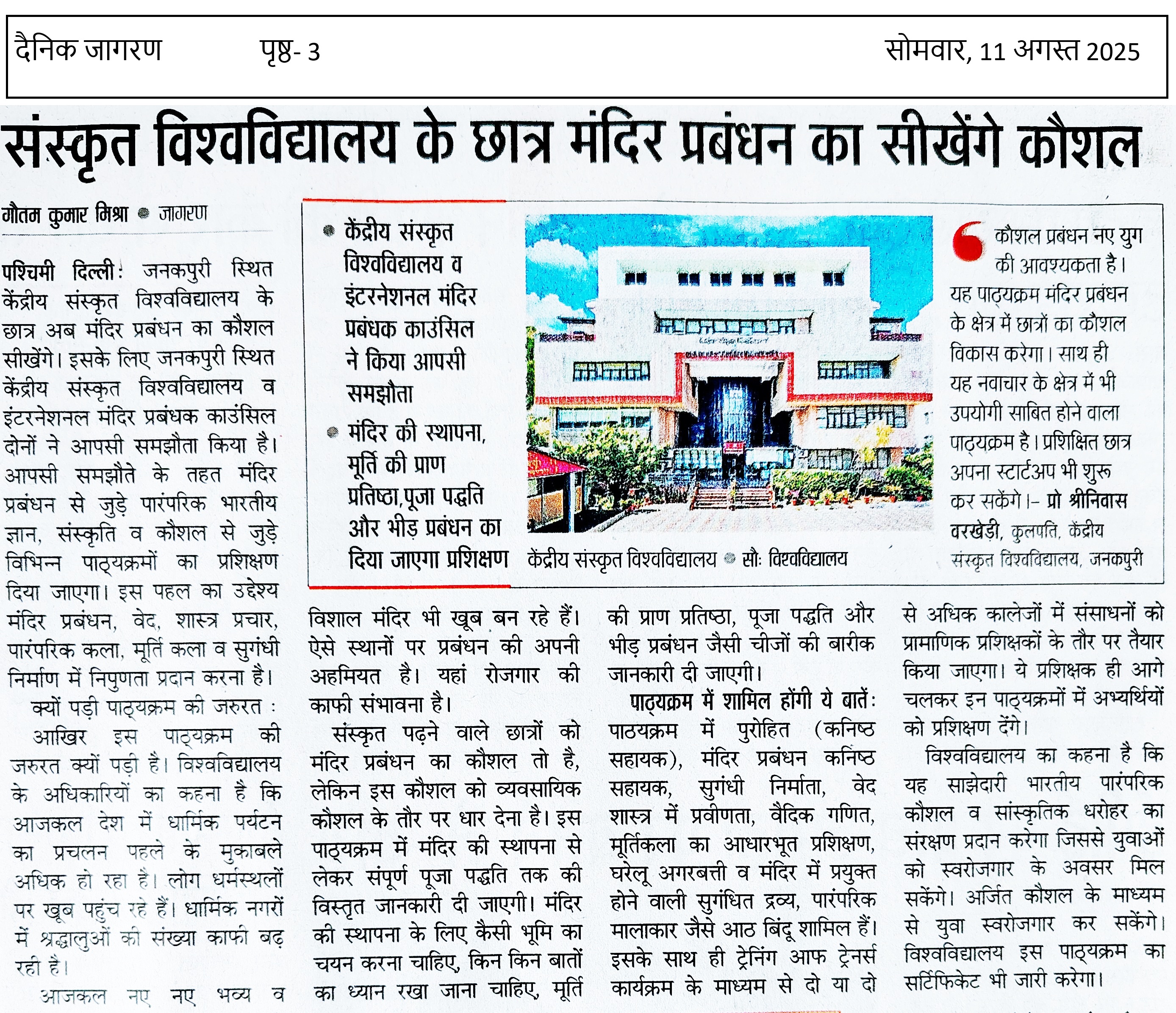 यह समाचार केन्द्रीय संस्कृत विश्वविद्यालय और इंटरनेशनल मंदिर प्रबंधक काउंसिल के बीच हुए समझौते पर आधारित है, जिसके तहत मंदिर प्रबंधन पाठ्यक्रम शुरू किया जाएगा। इस कार्यक्रम के अंतर्गत छात्रों को मंदिर स्थापना, मूर्ति प्राण प्रतिष्ठा, पूजा पद्धति, भीड़ प्रबंधन, पारंपरिक कला, सुगंध निर्माण और संबंधित कौशलों का प्रशिक्षण दिया जाएगा, जिसका उद्देश्य रोजगार योग्यता बढ़ाना, स्वरोजगार को प्रोत्साहित करना और बढ़ते धार्मिक पर्यटन के बीच सांस्कृतिक धरोहर का संरक्षण करना है।