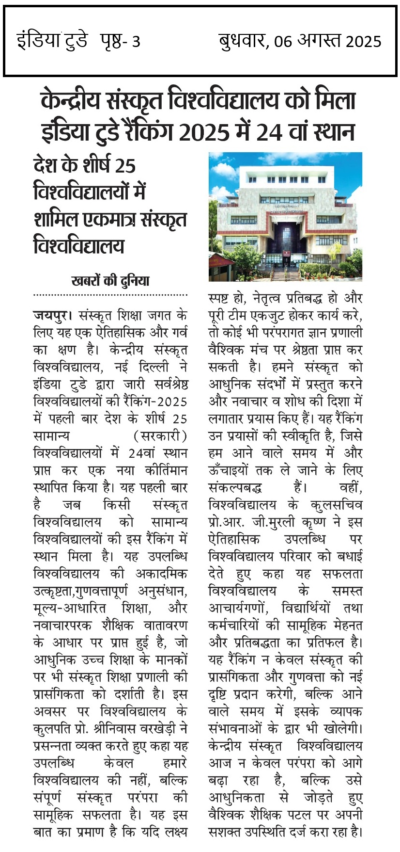 This news article is based on the India Today Ranking 2025, where Central Sanskrit University, New Delhi, secured the 24th position among the top 25 general government universities in India. This is the first time a Sanskrit university has achieved this ranking, reflecting its academic excellence, innovative research, and modern educational approach. Vice-Chancellor Prof. Shrinivasa Varakhedi described it as a collective success of the Sanskrit tradition. Registrar Prof. R.G. Murali Krishna praised the dedication of faculty, students, and staff. The recognition reinforces Sanskrit’s relevance in the contemporary global education system.