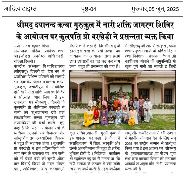 | dc.description | This news article is based on the 10-day Women Empowerment Awareness Camp organized at Shrimad Dayanand Kanya Gurukul, Ruchotipura, in which students from various campuses of the Central Sanskrit University (CSU), New Delhi, actively participated.Honable Vice-Chancellor Prof. Shrinivasa Varakhedi, of CSU, expressed his happiness and described the camp as highly beneficial for women’s empowerment, cultural and spiritual development. The presence of Prof. Madan Mohan Jha, R.G. Murali Krishna, Prof. Madhukeshwar Bhatt, Prof. Kashinath Nyaupane, Dr. P.M. Gupta, and Dr. Amrita Kaur in the program was noteworthy. | en |