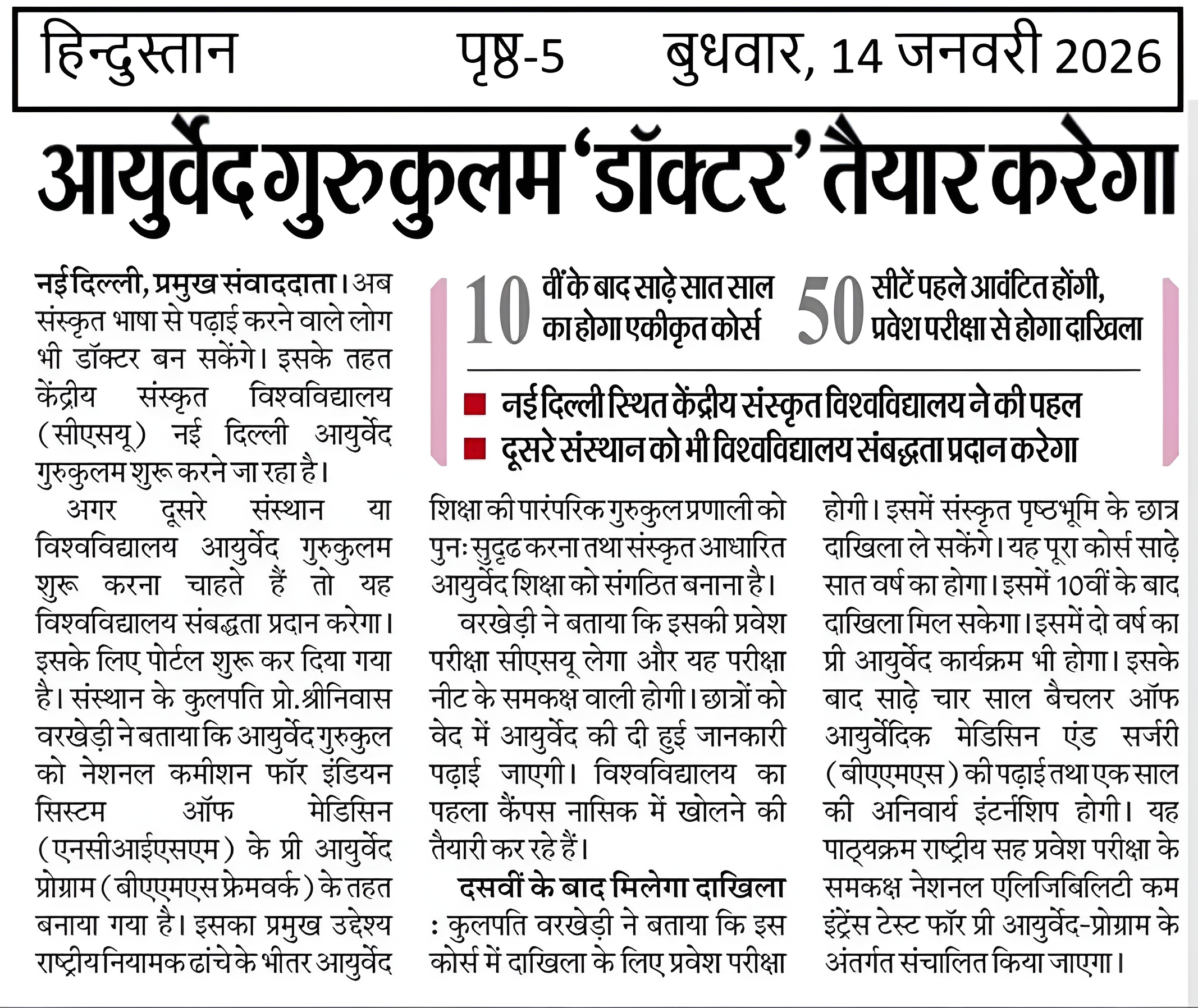 यह समाचार लेख नई दिल्ली स्थित केन्द्रीय संस्कृत विश्वविद्यालय द्वारा आयुर्वेद गुरुकुलम् कार्यक्रम के शुभारंभ पर आधारित है। इस पहल के अंतर्गत कक्षा 10 के बाद संस्कृत माध्यम से भावी आयुर्वेद चिकित्सकों को प्रशिक्षित करने हेतु साढ़े सात वर्षीय एकीकृत पाठ्यक्रम प्रारंभ किया गया है, जिसमें सीमित सीटों के लिए राष्ट्रीय स्तर की प्रवेश परीक्षा के माध्यम से चयन किया जाएगा। इस कार्यक्रम का उद्देश्य पारंपरिक आयुर्वेद शिक्षा को औपचारिक शैक्षणिक ढांचे में सुदृढ़ करना है। इसकी शुरुआत नासिक में प्रस्तावित समर्पित परिसर से होगी तथा अन्य संस्थानों के लिए संबद्धता पोर्टल भी विकसित किया गया है।